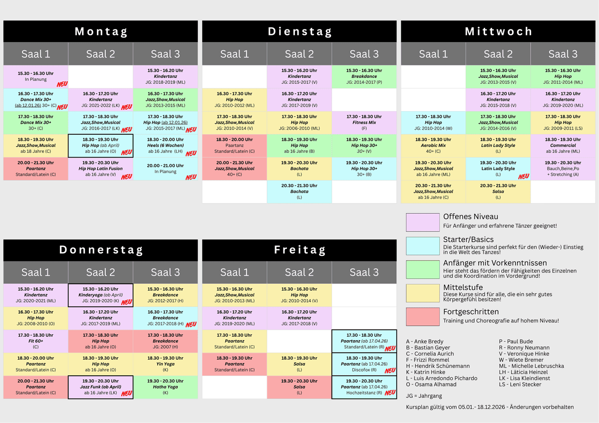 Vorläufiger Kursplan ab dem 5. Januar 2026